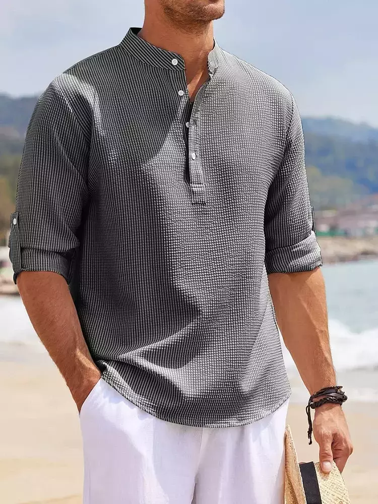 Camisas masculinas de linho e algodão de manga comprida, gola baixa, monocromática, Esporte fino, casual, estilo praia, também para plus size, S-5XL, primavera, outono, verão.